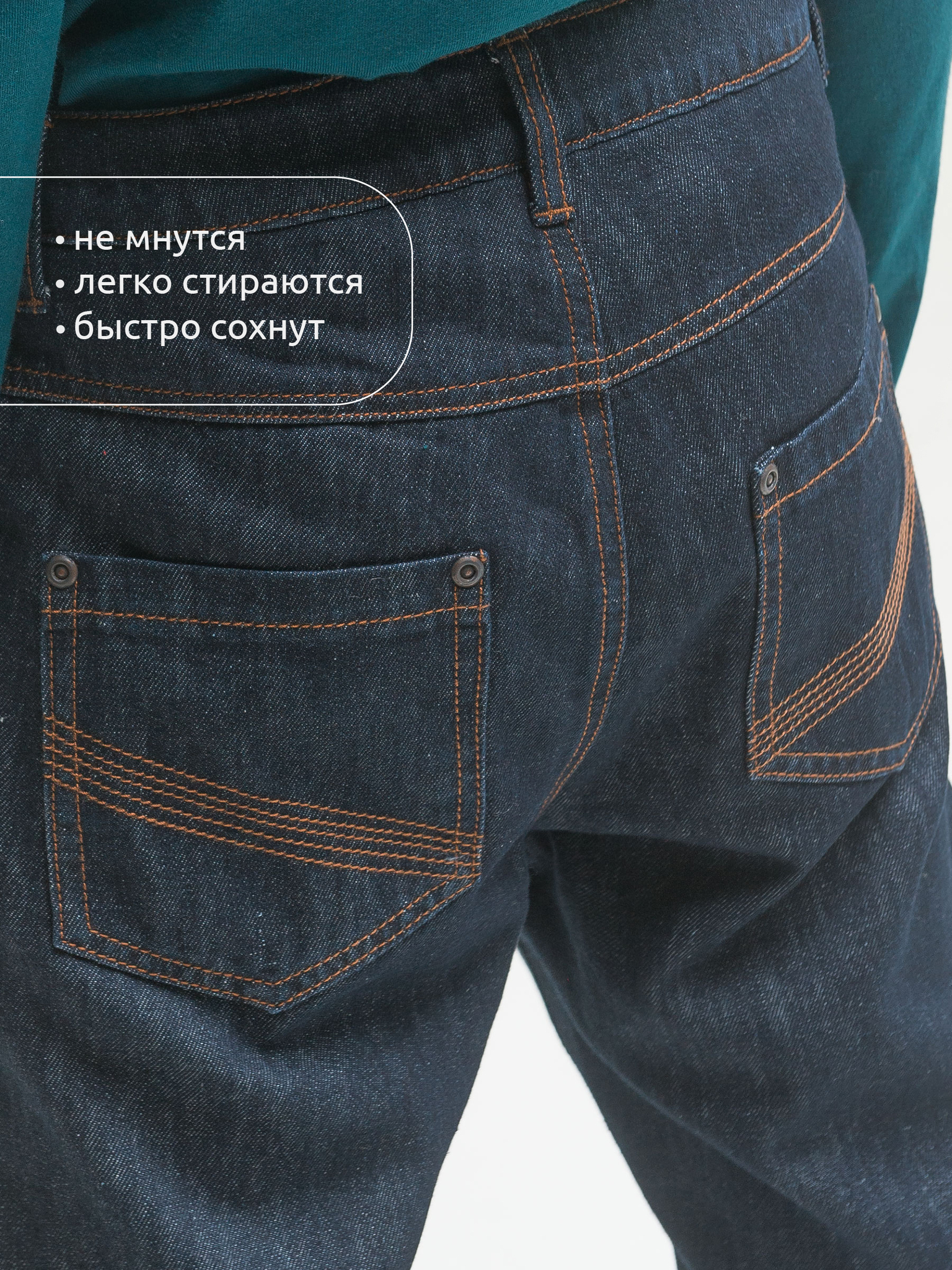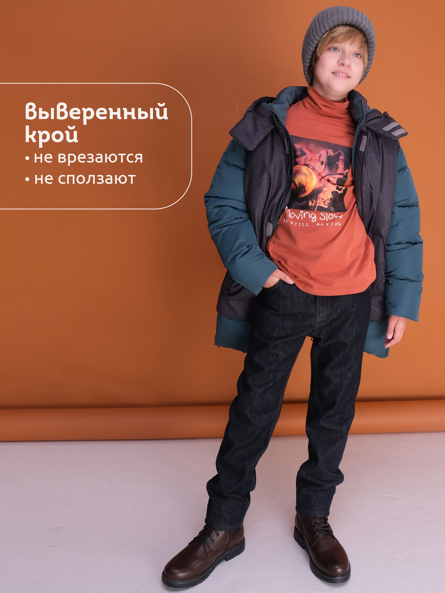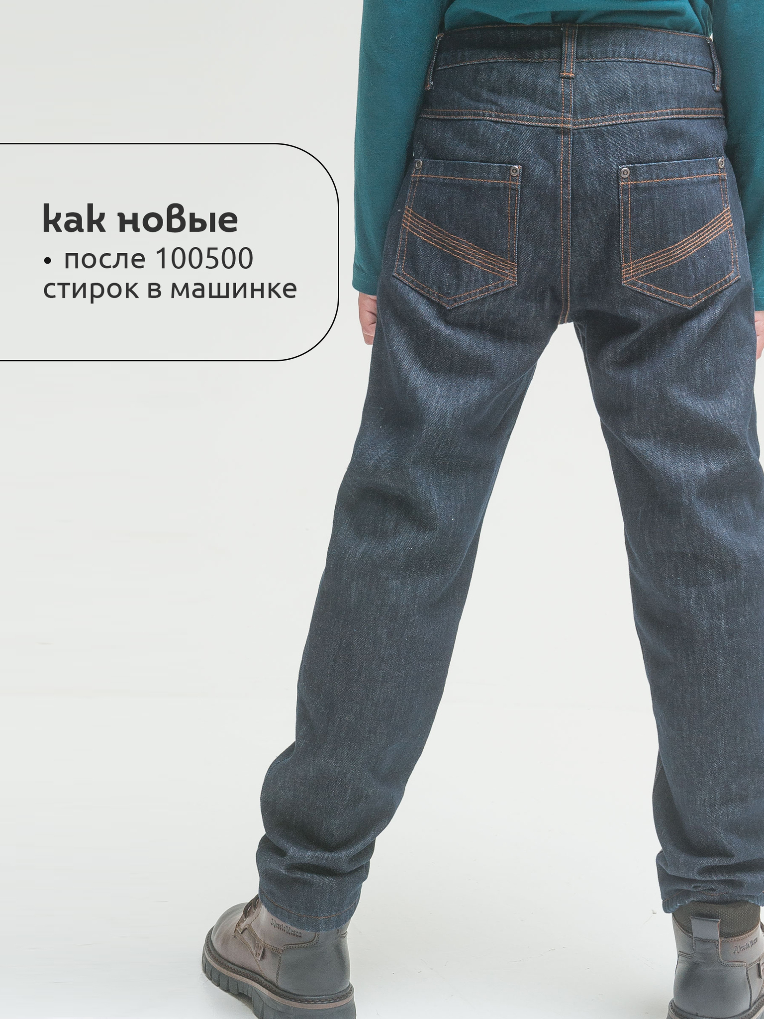 Утепленные джинсы на подкладе из флиса для мальчика. Основная ткань теплая, прочная, долго сохраняющая аккуратный вид, с большим содержанием хлопка – комфортно носить, легко ухаживать. Увеличенный объем, легкое сужение книзу – комфорт и удобство в динамике. Широкая резинка по линии талии отлично сидит и не натирает, объем регулируется внутренним шнуром – брюки не спадают, ремень не требуется. Имитация гульфика спереди. Удобные карманы для важных мелочей. Заклепки, декоративные строчки оранжевой нитью – нестареющая джинсовая классика. Джинсы прекрасно комбинируются с худи, толстовками, свитшотами. Незаменимы для создания стильного повседневного образа.