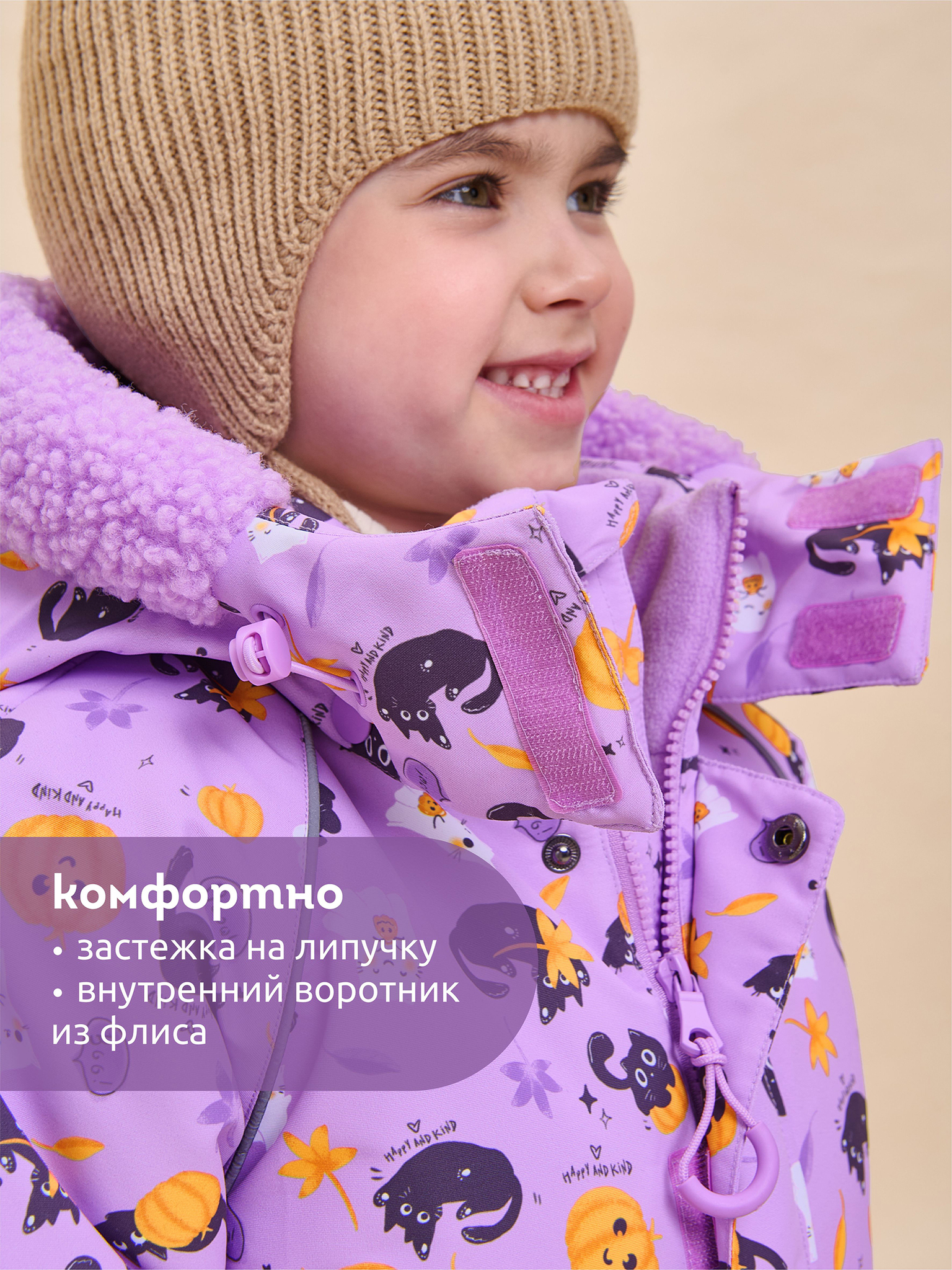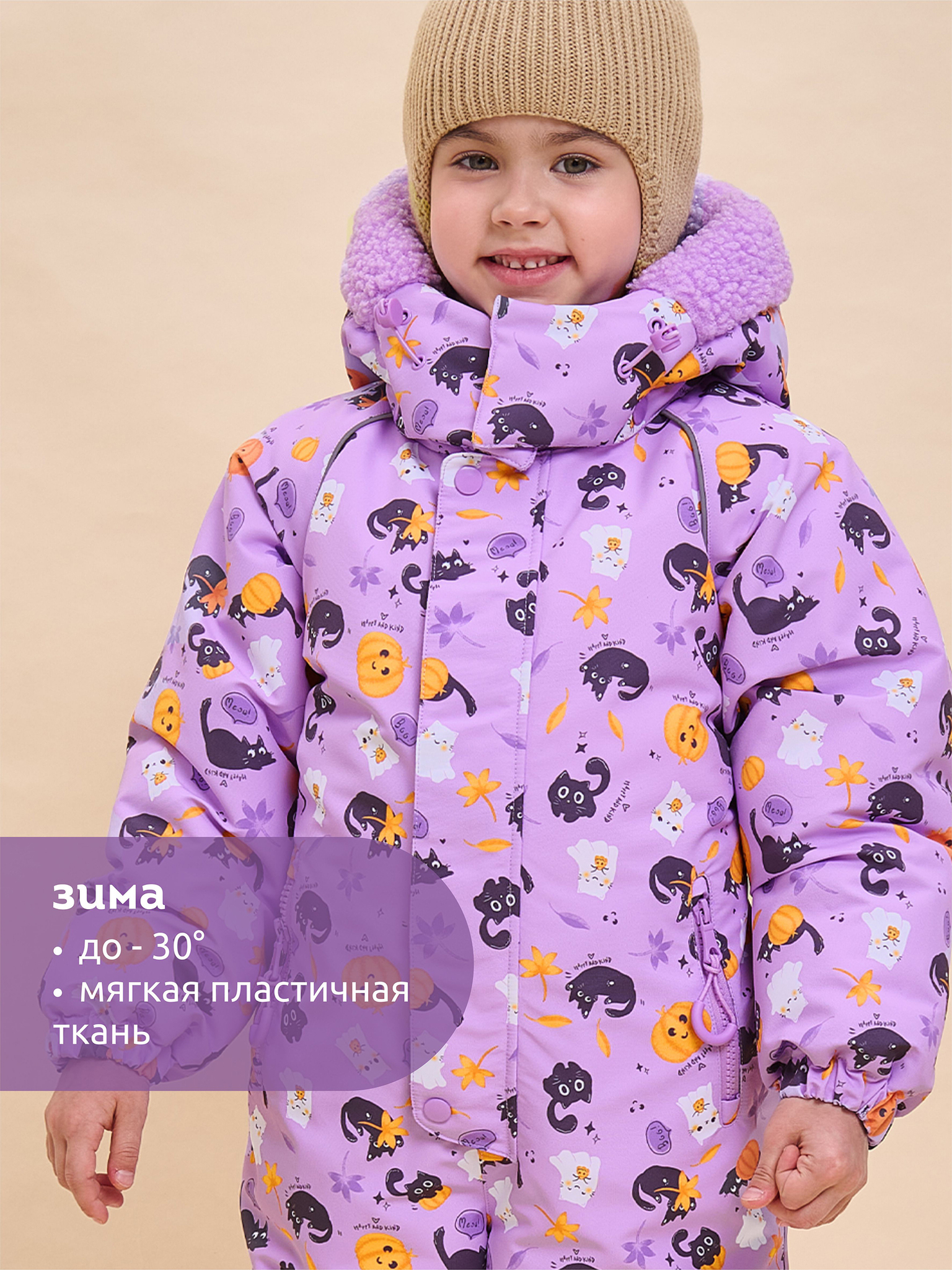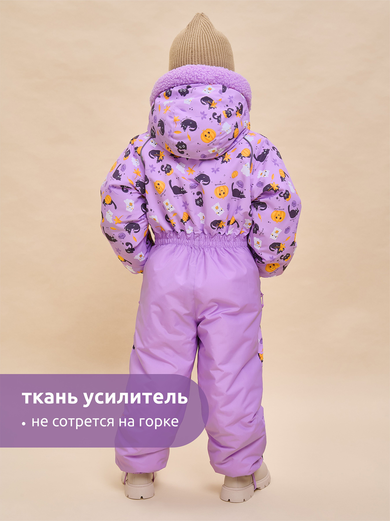Комбинезон зимний детский из мембранной ткани для девочки. Модель свободного объёма с рукавами кроя реглан - ребёнку комфортно и не стесняет движения. На внешнюю поверхность материала нанесена водоотталкивающая пропитка (DWR), она задерживает грязь и влагу снаружи — ребёнок не промокнет от снега, а комбинезон легко отстирается. Также есть дополнительная пропитка на внутренней стороне ткани — для более надёжной защиты от промокания. Капюшон двухшовный, что обеспечивает анатомически правильную форму и комфортную посадку по голове. Капюшон не отстегивается, предусмотрена регулировка объема эластичными шнурами с пластиковыми стопперами. Внешний край капюшона декорирован мягким искусственным мехом, по текстуре напоминающим «барашка». Из этого же материала выполнена внутренняя подкладка капюшона, она комфортная, тактильно приятная. Удобная центральная застёжка на тракторную молнию. Тканевый стоппер защищает подбородок от зажима молнией. Фиксирующая строчка предохраняет планку от «заедания» в процессе застёгивания. Комбинезон тёплый — для оптимальной защиты от ветра и холода центральная молния дополнительно закрыта ветрозащитной планкой на кнопках и липучках (велькро). Спинка по талии присборена на внутреннюю резинку — комбинезон для девочки зимний безупречно садится по фигуре и не выглядит мешковато. Внутри комбинезона эластичные лямки — есть возможность снимать только верхнюю часть в помещении. Карманы с боковым входом закрываются на водонепроницаемую молнию со скрытыми звеньями — содержимое карманов не промокнет от снега во время активных игр на свежем воздухе. Внутри карманы утеплены мягким флисом. Замок дополнен тканевыми стопперами, что предохраняет его от разрыва. На пуллере эластичный запаянный шнур — ребёнку легко открывать и закрывать даже в варежках. Манжеты рукавов и брючин на комфортных широких резинках, это предохраняет от попадания внутрь снега. На муфтах брюк антискользящая резинка. Комбинезон дополнен съёмными силиконовыми штрипками. Область колен и нижняя часть спинки усилены более плотной тканью — можно смело кататься с горки и ползать на коленках сколько захочется. В каждом изделии нейм-лейбл! Ребёнок не потеряется и не потеряет комбинезон! Световозвращающие канты в проймах переда и спинки — безопасность в тёмное время суток. Модель красивого трендового цвета декорирована милым девичьим принтом. Комбинезон на молнии неприхотлив в уходе — ухаживать согласно указанным на вшивных ярлыках рекомендациям. Изделие выполнено из полиэстера с мембраной — оно не только защищает от холода и влаги, но и хорошо пропускает воздух, давая коже ребёнка дышать. Подкладка из мягкого, тёплого и дышащего флиса (по переду и спинке). В рукавах и штанинах подкладка из тонкого и гладкого полиэстера — благодаря этому ребенку легко надевать комбинезон, руки и ноги не путаются в рукавах и штанинах, а легко проскальзывают. Зимний комбинезон детский идеален для маленьких девочек дошкольного и младшего школьного возраста. Рекомендуемый температурный режим: не ниже минус 25 градусов. В изделии использован один из высокотехнологичных утеплителей — феллекс 260 г/м2. Дышащие свойства мембраны: не менее 3000 г/м2/сут. — ребёнку будет комфортно на прогулке. Модель подходит для носки в детский сад, для прогулок и отдыха н