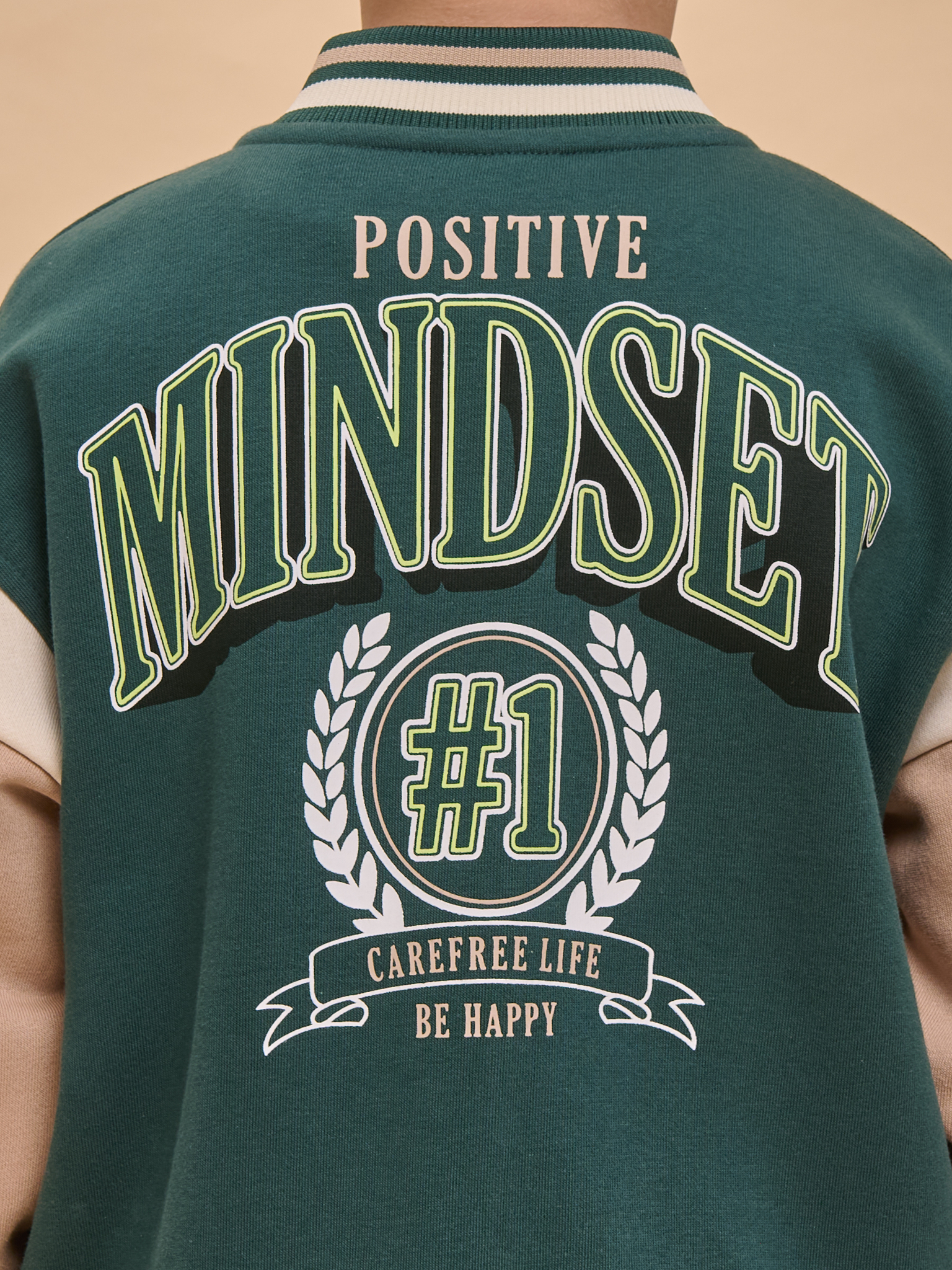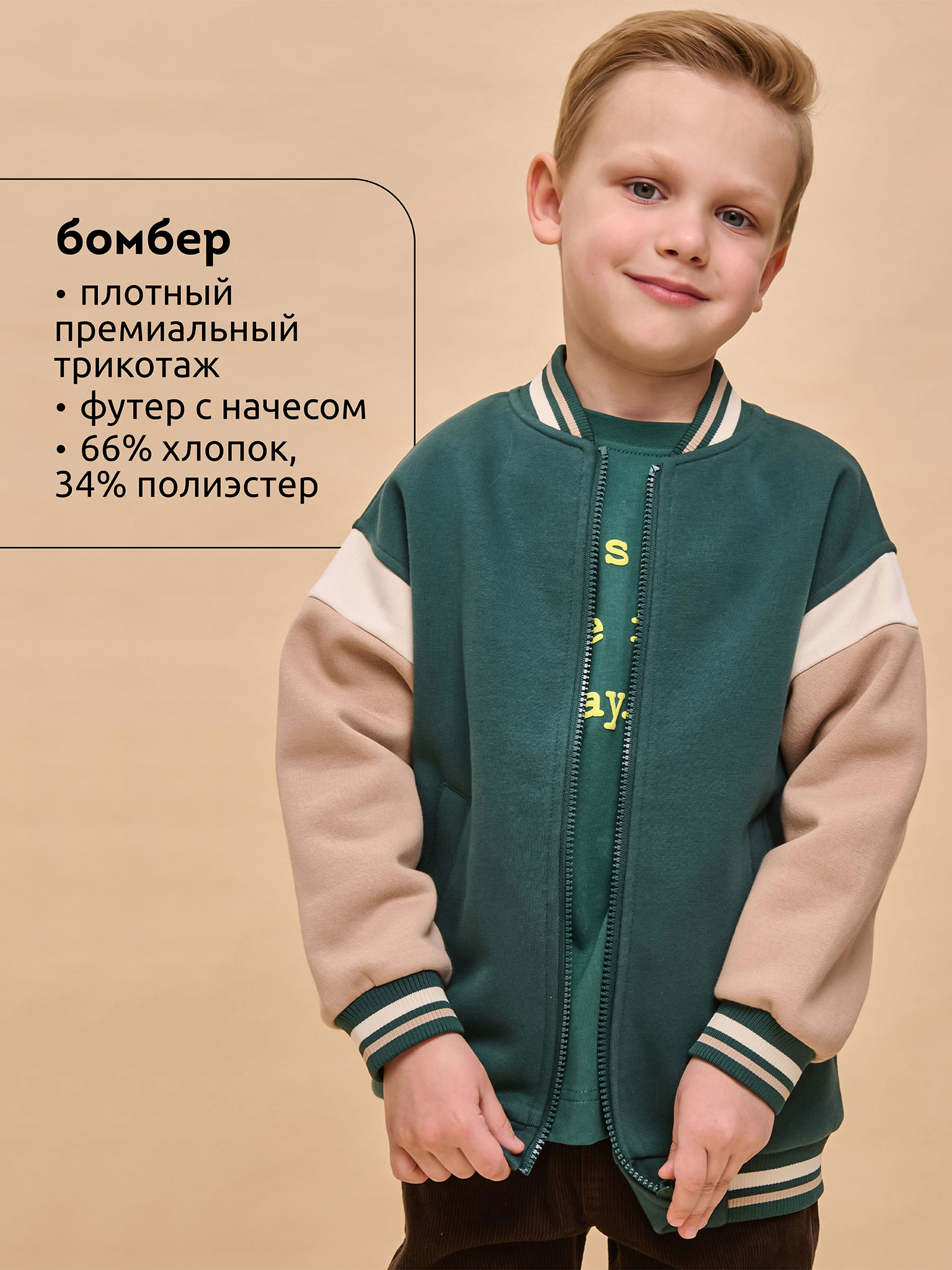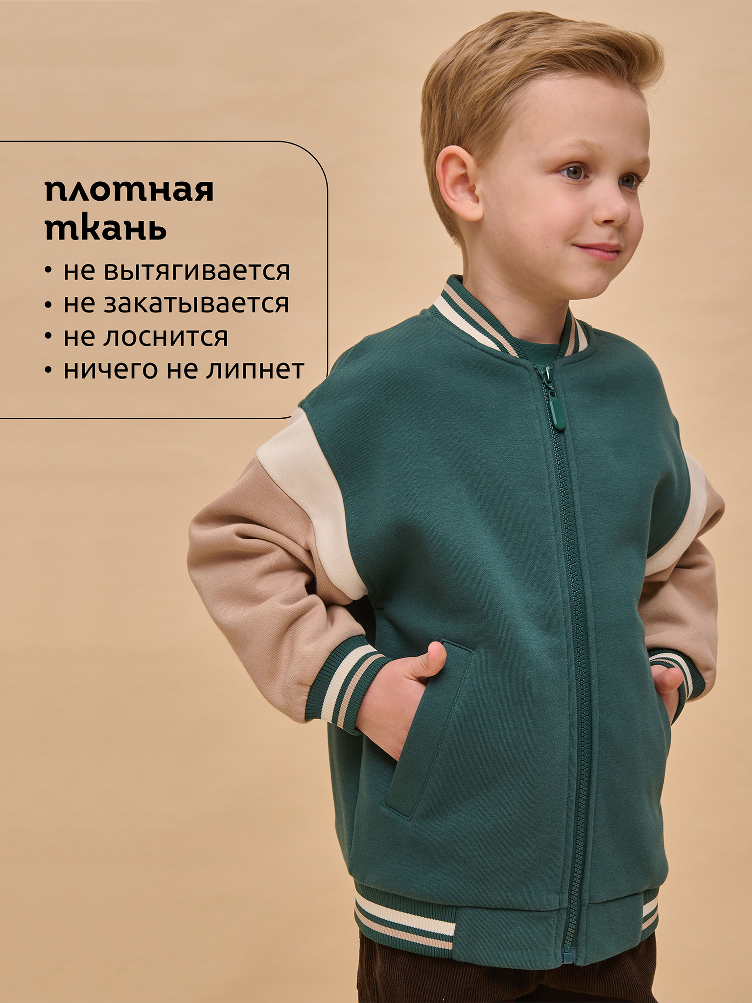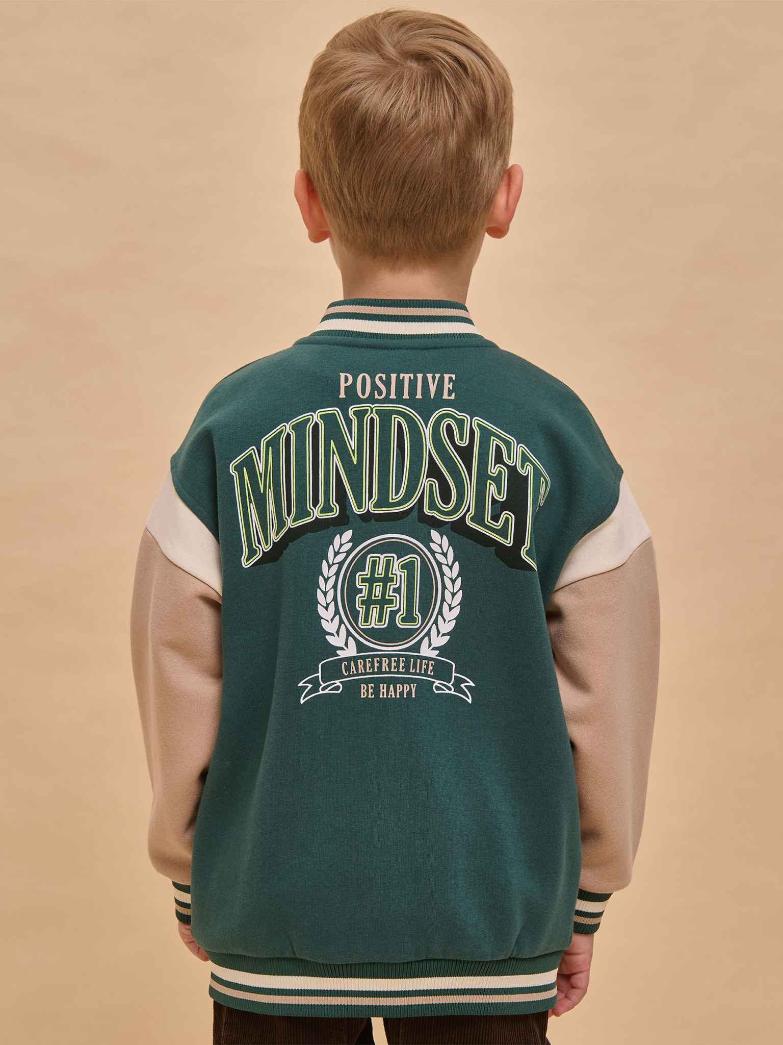 Бомбер детский для мальчиков. Стильная куртка в актуальном университетском стиле из тёплого футера с начёсом заменит ветровку в прохладную погоду. Модель свободного силуэта со спущенным плечом — ребёнку комфортно и свободно. Жакет на мальчика застёгивается на центральную молнию — актуально и практично. Горловина, низ изделия и рукавов отделаны широкой декоративной рибаной (ткань в рубчик), она эластичная и прекрасно тянется, долгое время не теряя формы. Модель выполнена из ткани с высоким содержанием хлопка — она дышащая, мягкая и комфортная. Благодаря полиэстеру бомбер сохраняет превосходный внешний вид надолго. Куртка детская дополнена удобными прорезными карманами по бокам. Бомбер для мальчика украшен принтом в модном университетском стиле по спинке. Ндписи переводятся: «позитивное мышление», «беззаботная жизнь», «будь счастливым». Жакет отлично сочетается с различными брюками и джинсами. Уютная и стильная куртка для мальчика неприхотлива в уходе. Помните о правильном уходе за изделием: рекомендуется стирать при температуре не выше 30 °C, без предварительного замачивания, с изнанки. Это поможет сохранить качество и цвет бомбера на длительное время. Не забывайте о выборе правильного размера. Используйте таблицу размеров на фотографии, чтобы выбрать подходящий вариант для вашего мальчика. Обратите внимание, что цвет товара на экране вашего устройства может отличаться от реального.