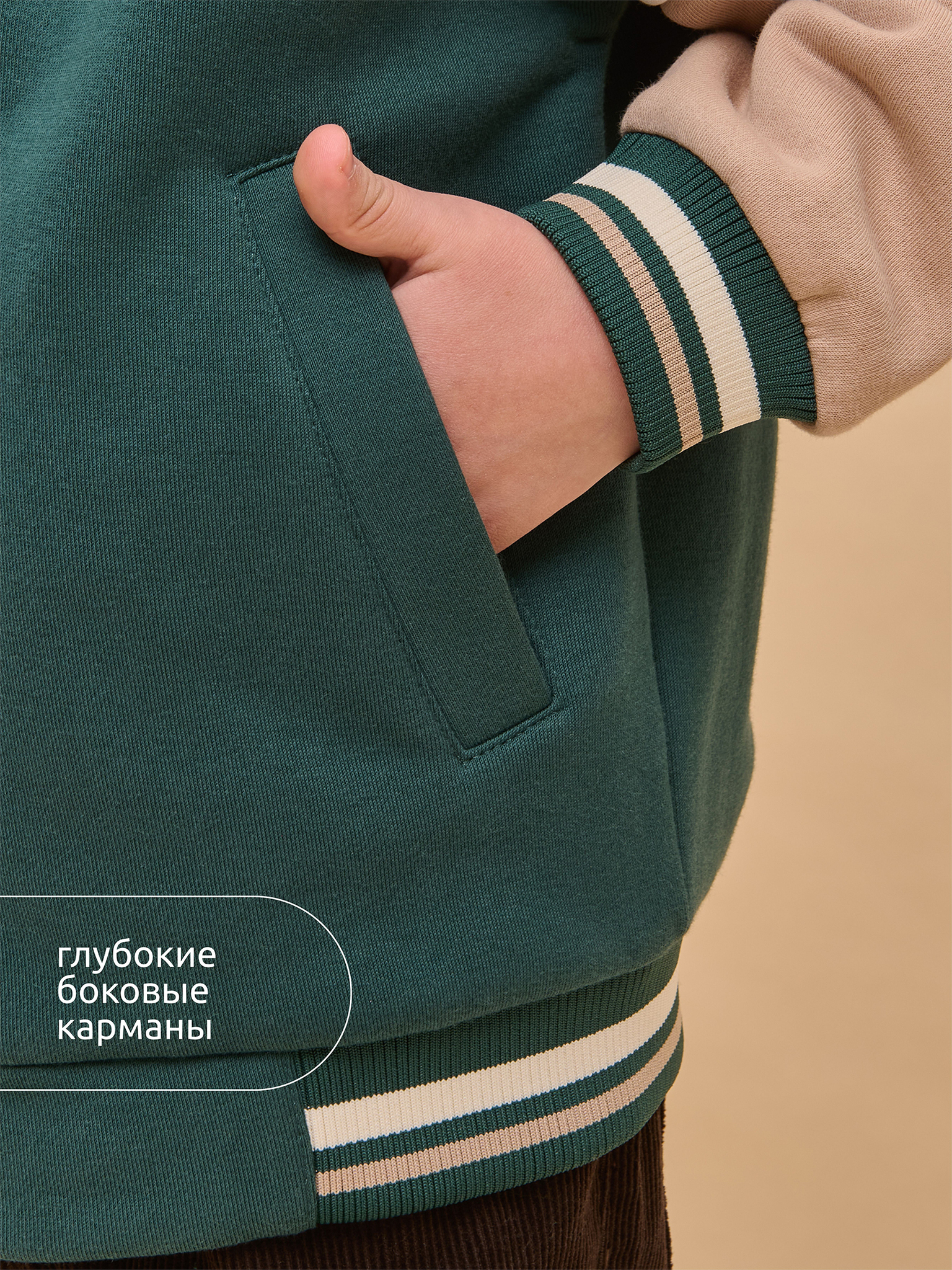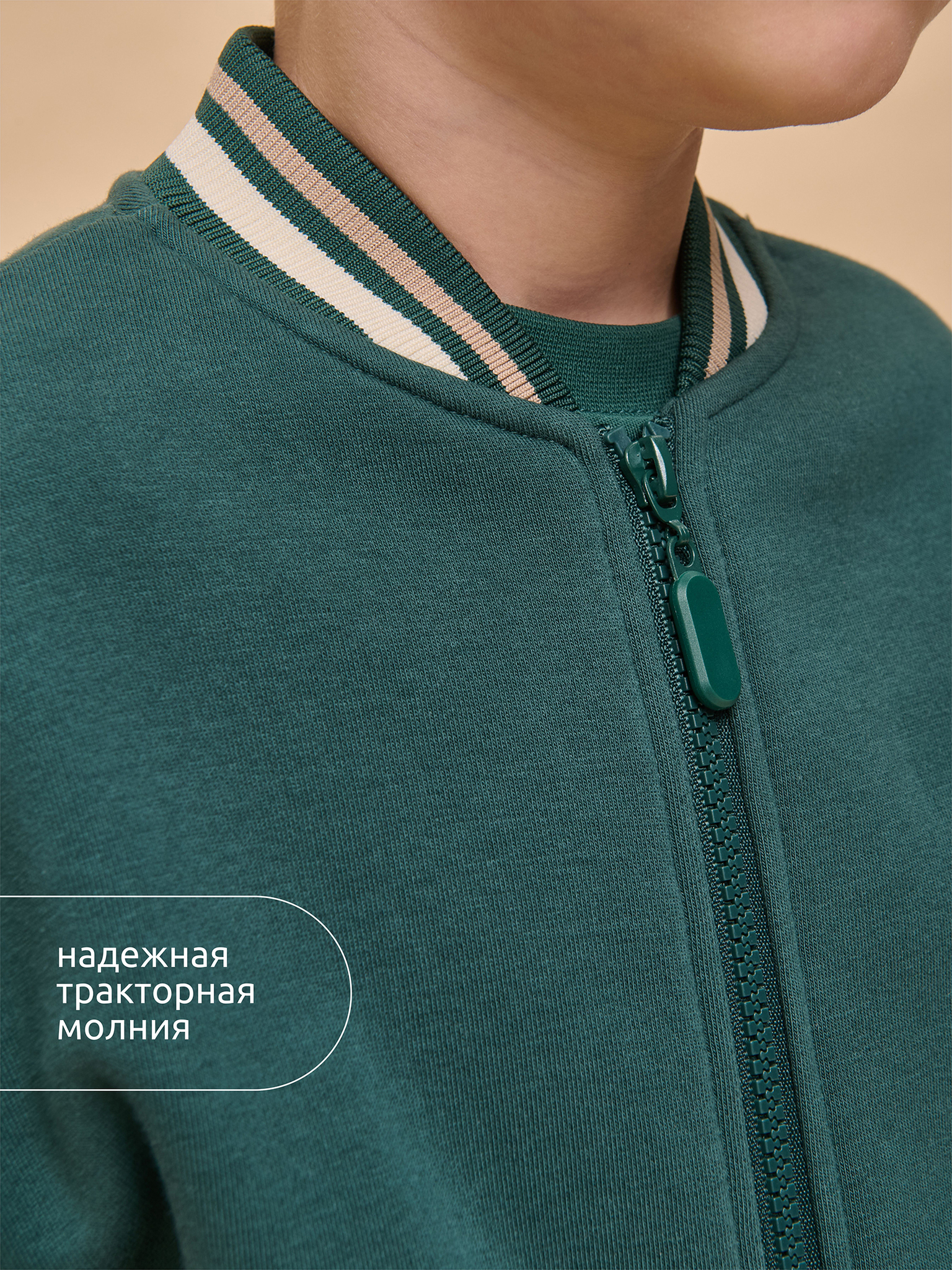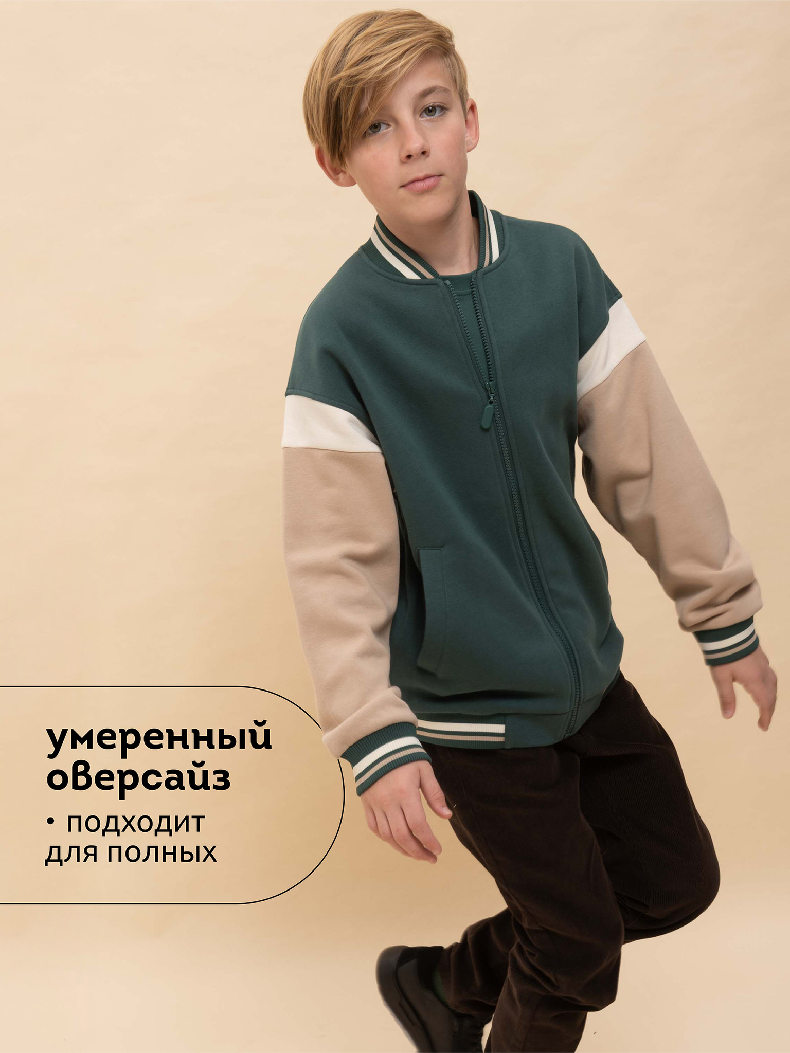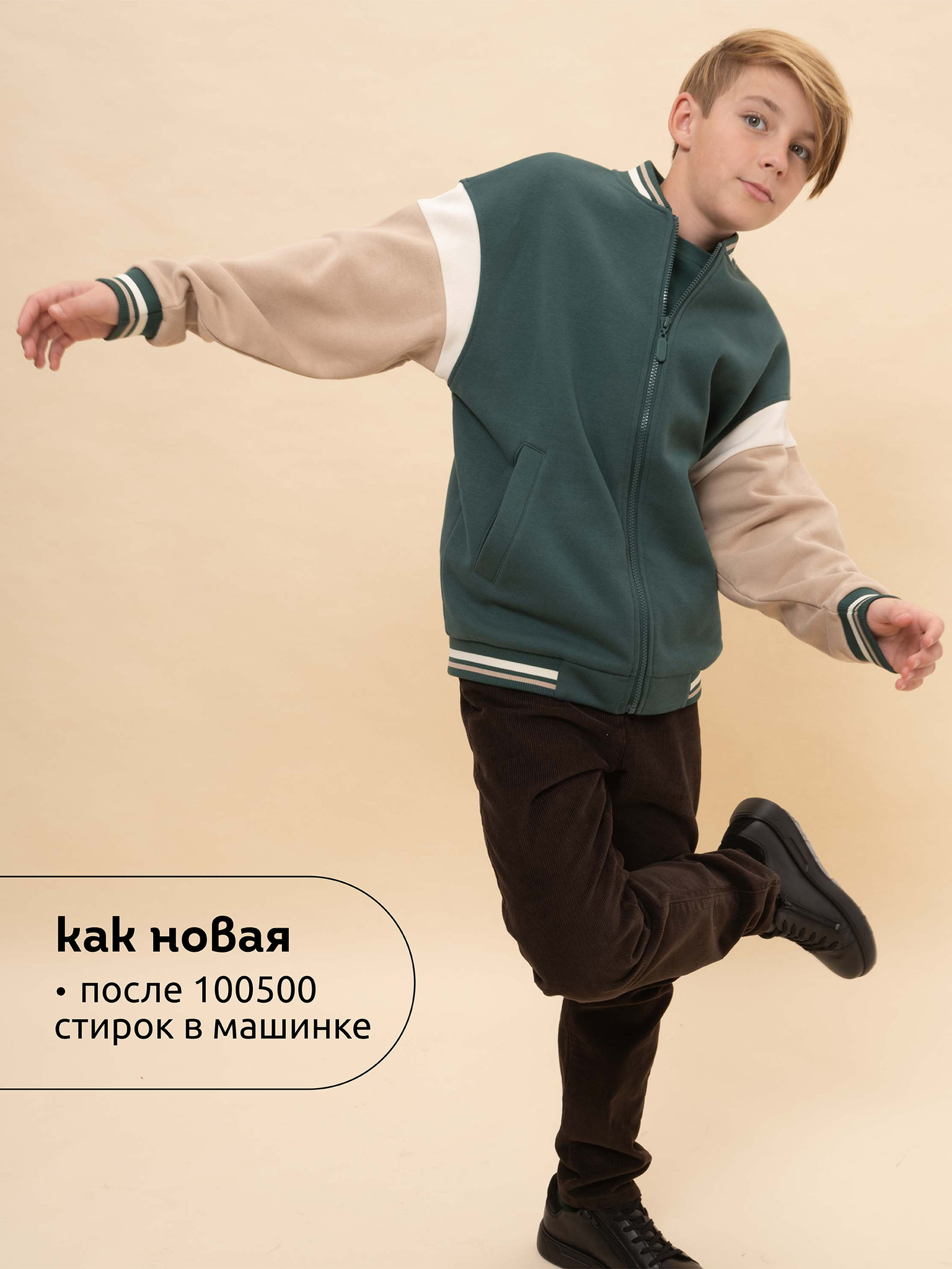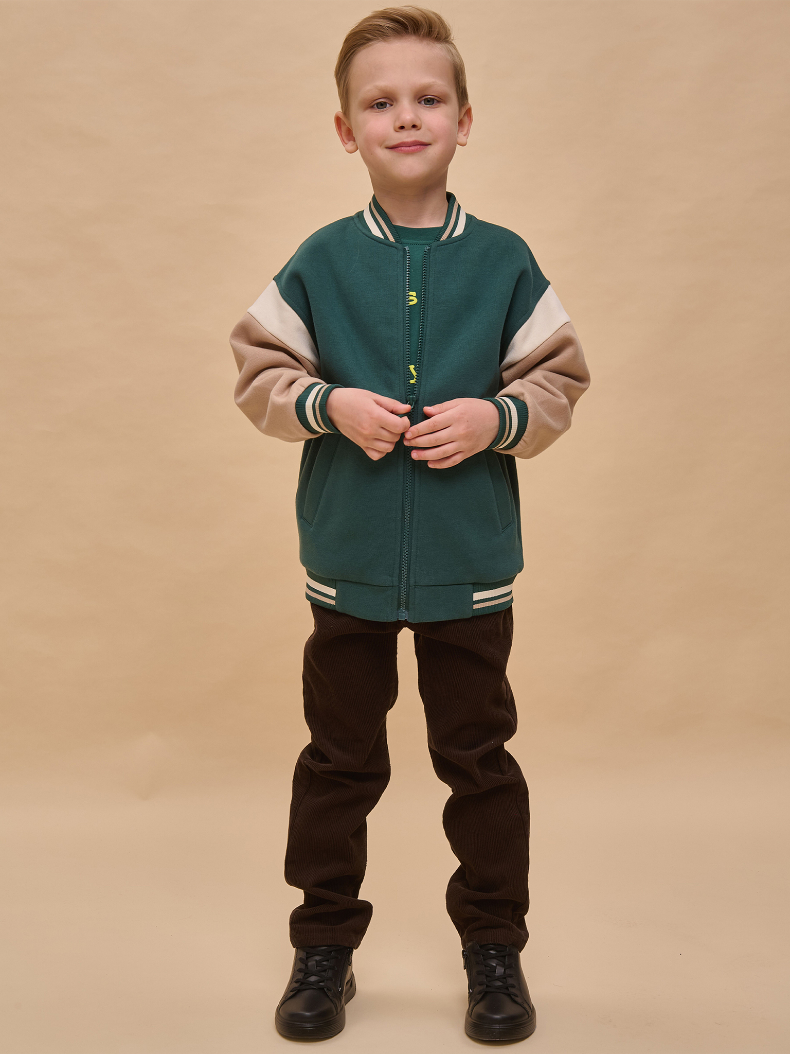 Бомбер детский для мальчиков. Стильная куртка в актуальном университетском стиле из тёплого футера с начёсом заменит ветровку в прохладную погоду. Модель свободного силуэта со спущенным плечом — ребёнку комфортно и свободно. Жакет на мальчика застёгивается на центральную молнию — актуально и практично. Горловина, низ изделия и рукавов отделаны широкой декоративной рибаной (ткань в рубчик), она эластичная и прекрасно тянется, долгое время не теряя формы. Модель выполнена из ткани с высоким содержанием хлопка — она дышащая, мягкая и комфортная. Благодаря полиэстеру бомбер сохраняет превосходный внешний вид надолго. Куртка детская дополнена удобными прорезными карманами по бокам. Бомбер для мальчика украшен принтом в модном университетском стиле по спинке. Ндписи переводятся: «позитивное мышление», «беззаботная жизнь», «будь счастливым». Жакет отлично сочетается с различными брюками и джинсами. Уютная и стильная куртка для мальчика неприхотлива в уходе. Помните о правильном уходе за изделием: рекомендуется стирать при температуре не выше 30 °C, без предварительного замачивания, с изнанки. Это поможет сохранить качество и цвет бомбера на длительное время. Не забывайте о выборе правильного размера. Используйте таблицу размеров на фотографии, чтобы выбрать подходящий вариант для вашего мальчика. Обратите внимание, что цвет товара на экране вашего устройства может отличаться от реального.