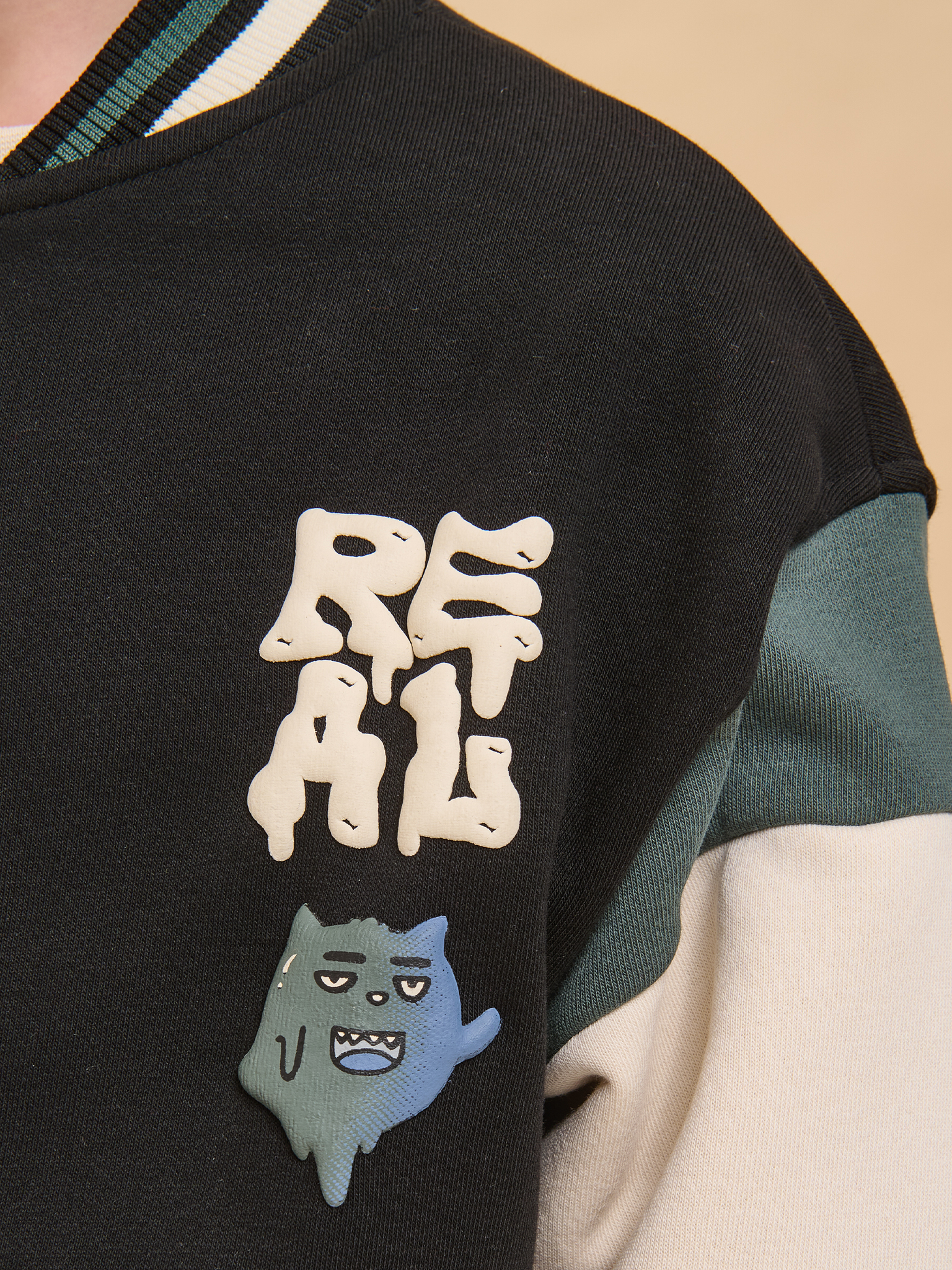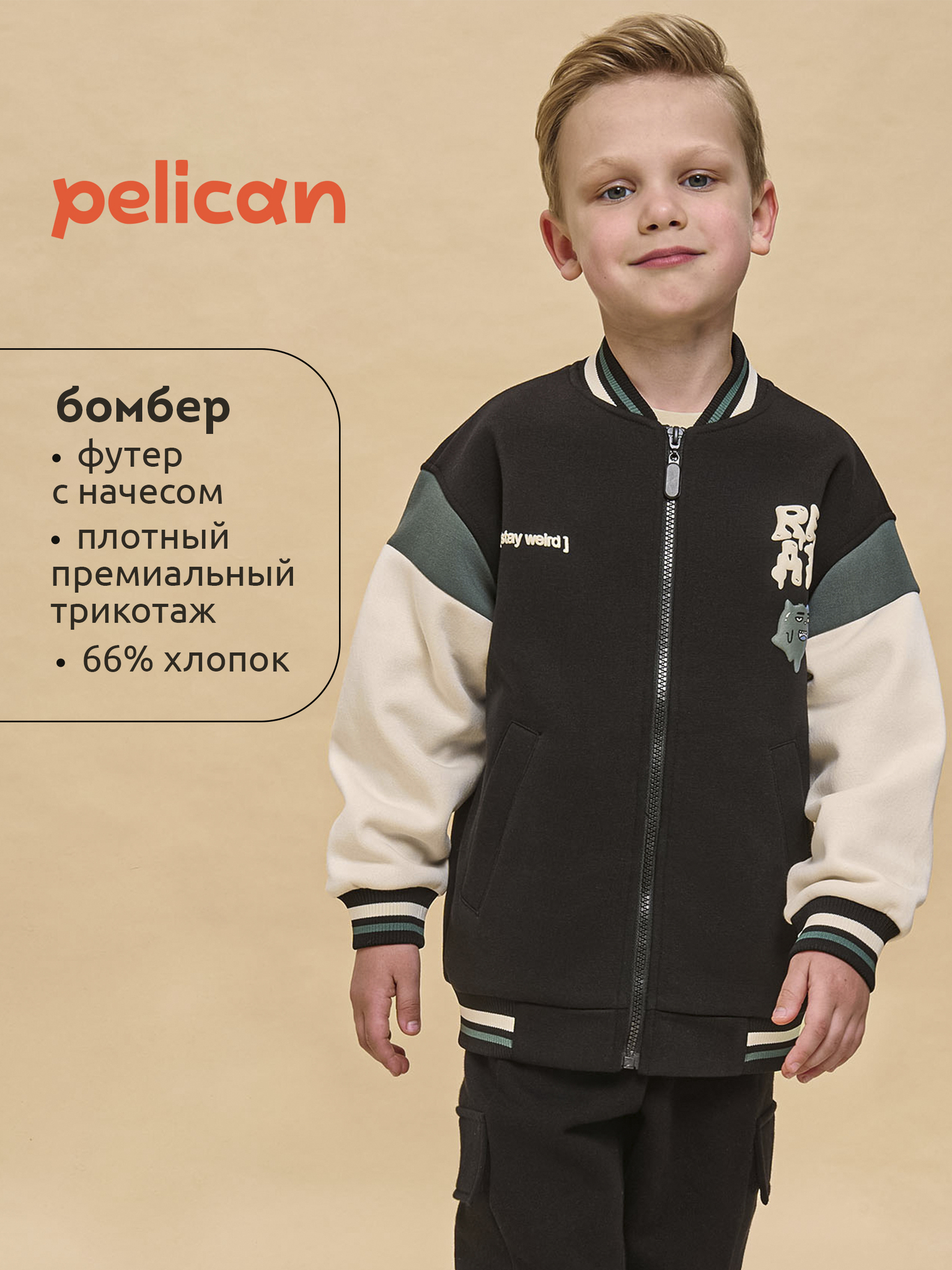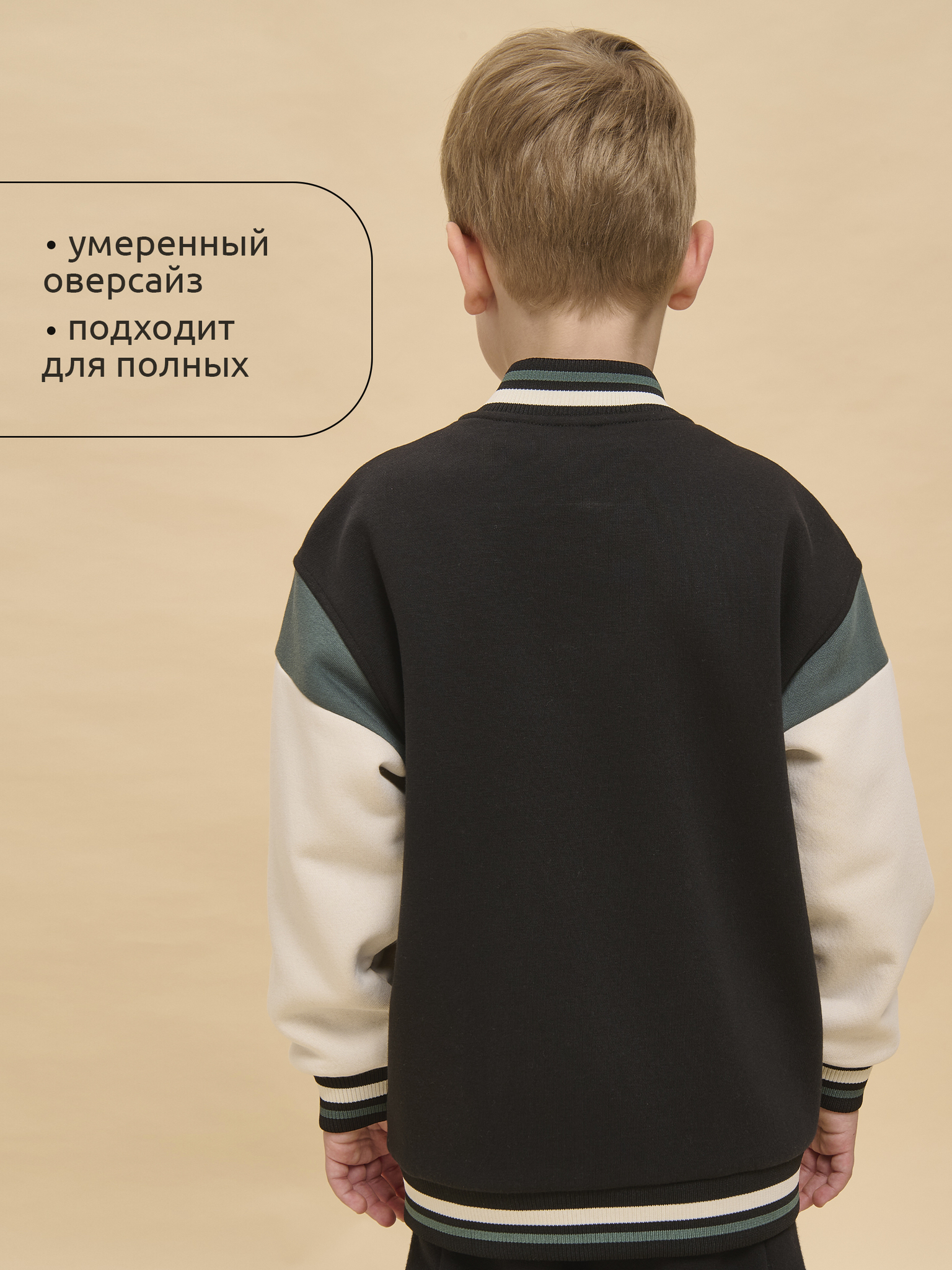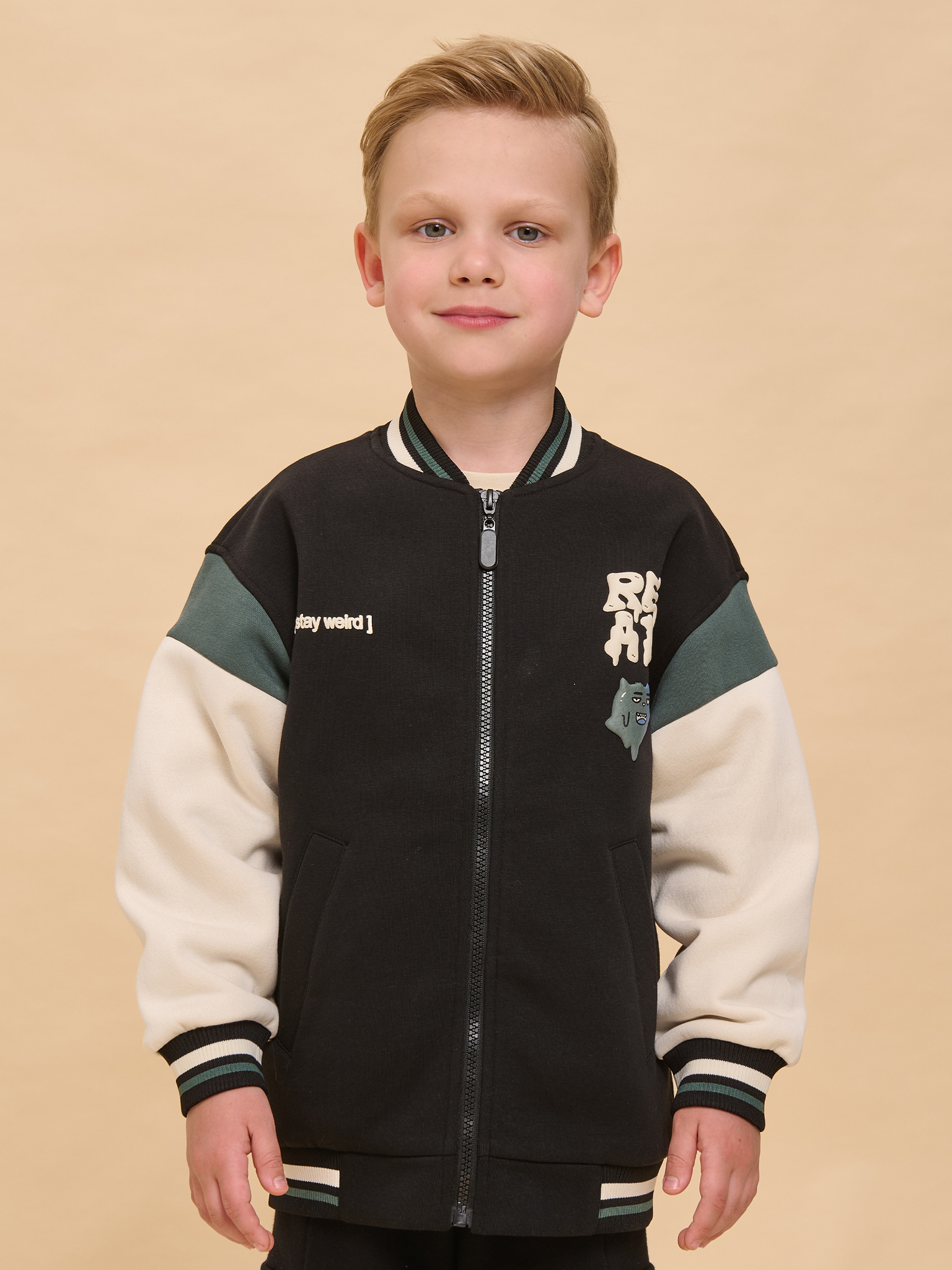 Бомбер детский для мальчиков. Стильная куртка в актуальном университетском стиле из тёплого футера с начёсом заменит ветровку в прохладную погоду. Модель свободного силуэта со спущенным плечом — ребёнку комфортно и свободно. Жакет на мальчика застёгивается на центральную молнию — актуально и практично. Горловина, низ изделия и рукавов отделаны широкой декоративной рибаной (ткань в рубчик), она эластичная и прекрасно тянется, долгое время не теряя формы. Модель выполнена из ткани с высоким содержанием хлопка — она дышащая, мягкая и комфортная. Благодаря полиэстеру бомбер сохраняет превосходный внешний вид надолго. Куртка детская дополнена удобными прорезными карманами по бокам. Бомбер для мальчика украшен принтом в модном готическом стиле по переду. Жакет отлично сочетается с различными брюками и джинсами. Уютная и стильная куртка для мальчика неприхотлива в уходе. Помните о правильном уходе за изделием: рекомендуется стирать при температуре не выше 30 °C, без предварительного замачивания, с изнанки. Это поможет сохранить качество и цвет бомбера на длительное время. Не забывайте о выборе правильного размера. Используйте таблицу размеров на фотографии, чтобы выбрать подходящий вариант для вашего мальчика. Обратите внимание, что цвет товара на экране вашего устройства может отличаться от реального.